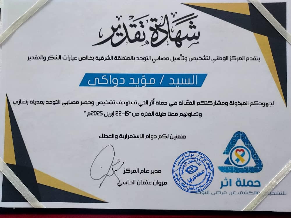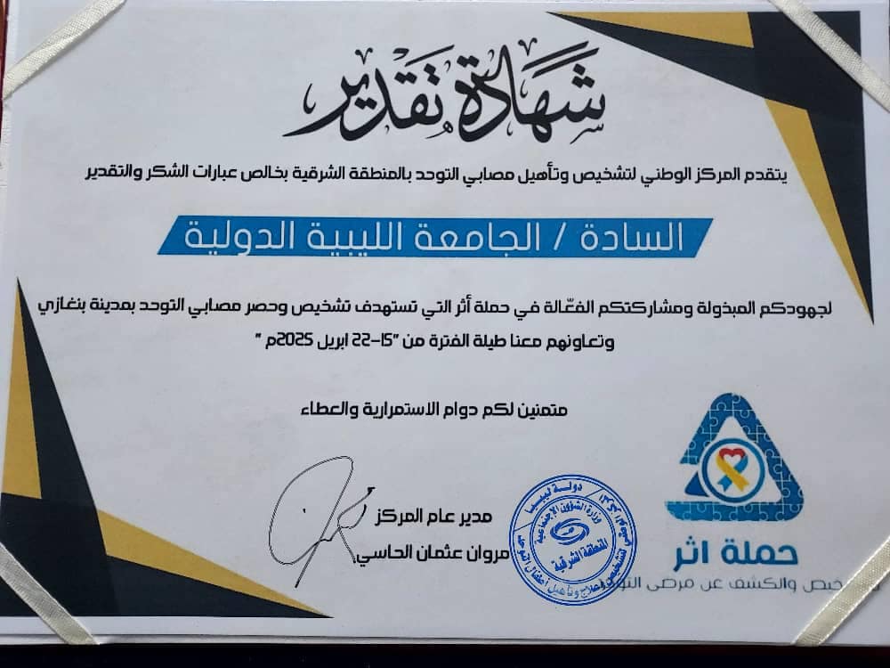 اختُتمت مساء الثلاثاء الثاني والعشرين من إبريل 2025، المشاركة الإيجابية والمميزة، لطلاب وموظفين من الجامعة الدولية في الحملة الوطنية لتشخيص وحصر مصابي اضطراب التوحد بمدينة بنغازي، والتي استمرت لمدة أسبوع (من 15 إلى 22 أبريل)، بتنظيم من المركز الوطني لأطفال التوحد وبالتعاون مع فضاء 360 التطوعية والجامعة الدولية وجمعية الهلال الأحمر..